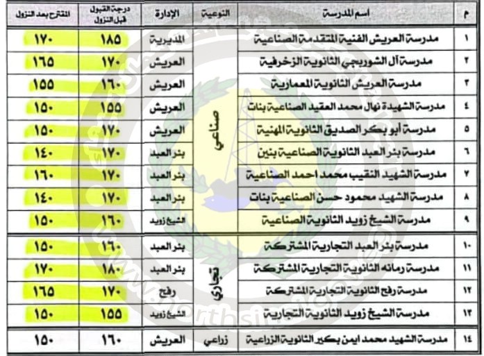 بالنسبة للتعليم التجاري تم النزول بدرجات القبول في مدرسه بئر العبد التجارية المشتركة الى 150 درجه بدلا من 160 درجة، مدرسه رمانه الثانوية التجارية المشتركة الى 170 درجه بدلا من 180 درجة ، مدرسه رفح الثانوية التجارية المشتركة الى 150درجة بدلا من 170 درجة، مدرسه الشيخ زويد الثانوية التجارية الى 150 درجه بدلا من 155 درجة.