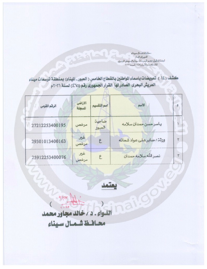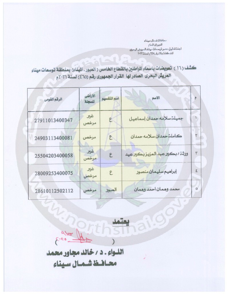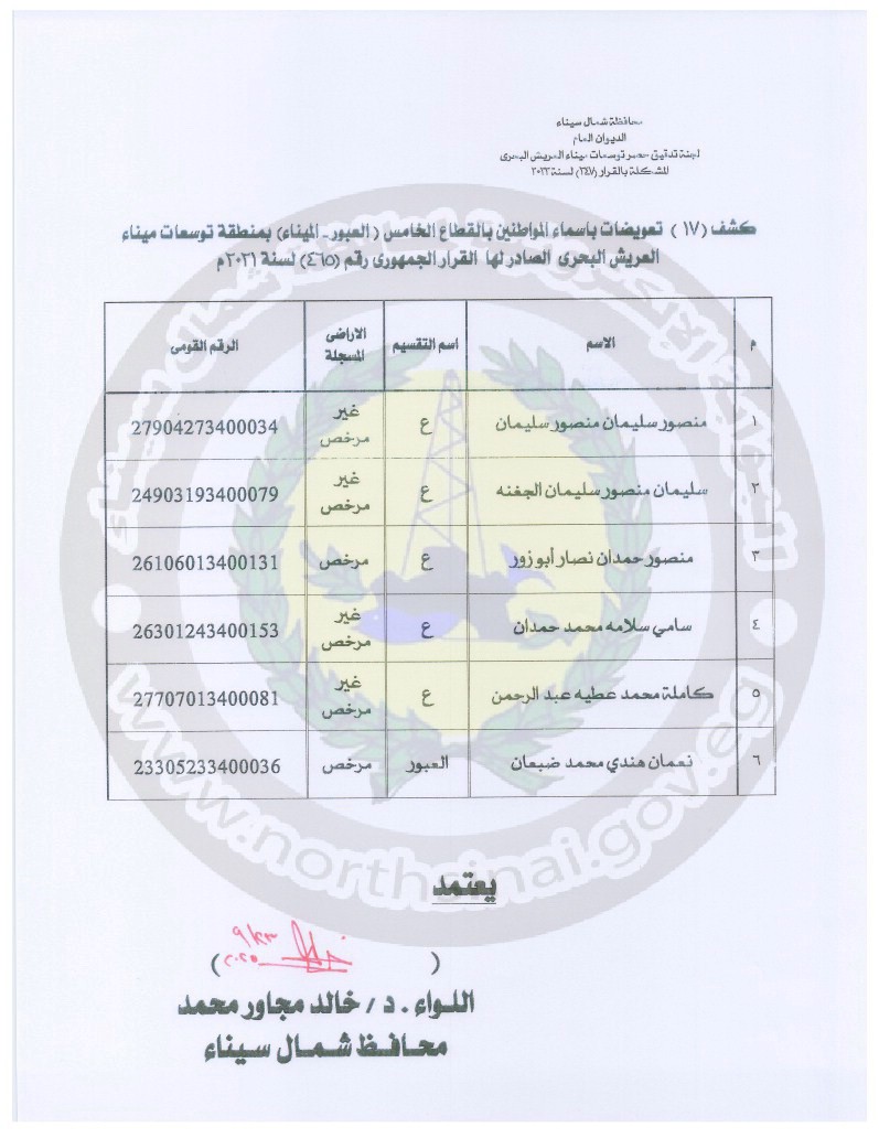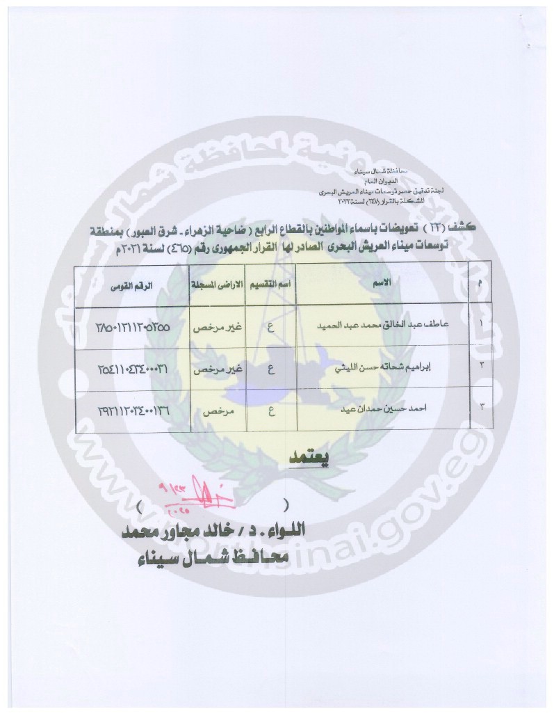 في إطار اهتمام الدولة والقيادة السياسية بسرعة إنهاء الإجراءات وصرف التعويضات ، وبتوجيهات اللواء الدكتور خالد مجاور ، محافظ شمال سيناء ، تقرر صرف التعويضات للمواطنين بالقطاعين الرابع ( ضاحية الزهراء - شرق العبور ) والخامس ( العبور - الميناء ).