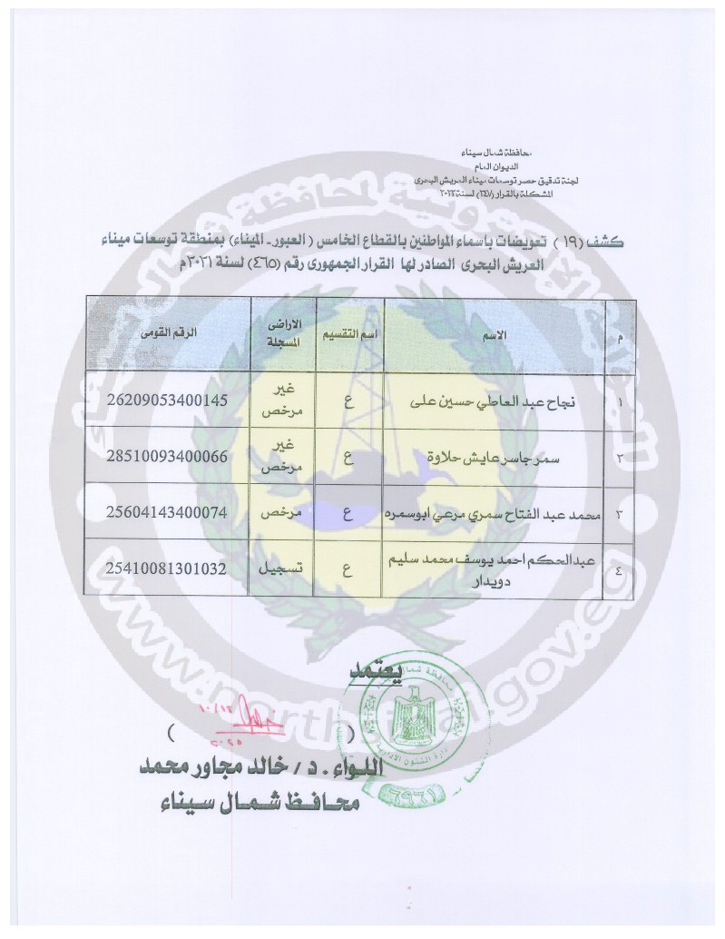 في إطار اهتمام الدولة والقيادة السياسية بسرعة إنهاء الإجراءات وصرف التعويضات ، وبتوجيهات اللواء الدكتور خالد مجاور ، محافظ شمال سيناء ، تقرر صرف التعويضات للمواطنين بالقطاعين الرابع ( ضاحية الزهراء - شرق العبور ) والخامس ( العبور - الميناء ).
