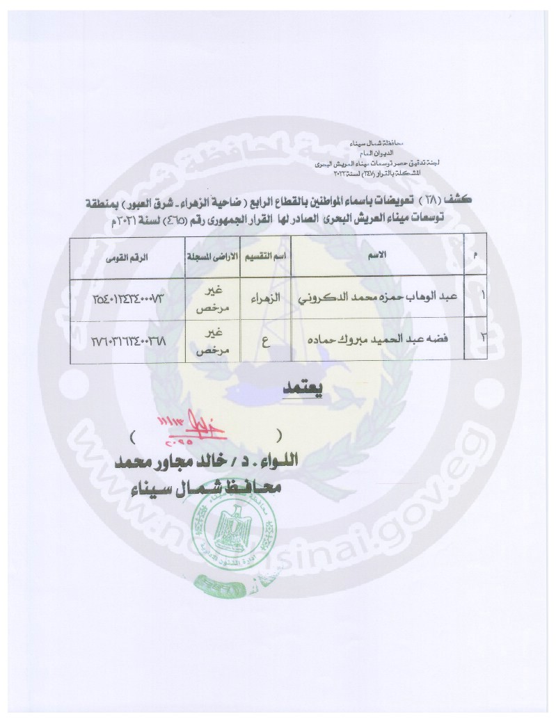 في إطار اهتمام الدولة والقيادة السياسية بسرعة إنهاء الإجراءات وصرف التعويضات ، وبتوجيهات اللواء الدكتور خالد مجاور ، محافظ شمال سيناء ، تقرر صرف التعويضات للمواطنين بالقطاعين الرابع (ضاحية الزهراء - شرق العبور ) والخامس ( العبور - الميناء ).