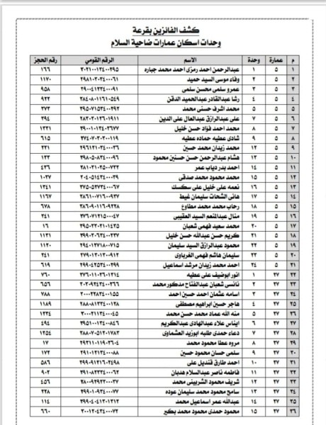 وقد أسفرت القرعة العلنية عن فوز عدد (36) مواطن مع تحديد أرقام العمارات والوحدات السكنية المخصصة لهم طبقا للكشف المرفق .