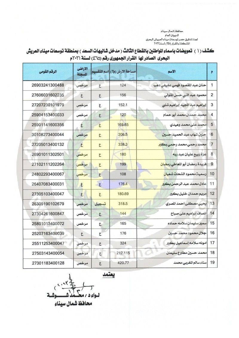 في إطار اهتمام الدولة والقيادة السياسية بسرعة إنهاء الإجراءات وصرف التعويضات ، وبتوجيهات اللواء الدكتور محمد عبد الفضيل شوشة ، محافظ شمال سيناء ، تقرر صرف التعويضات للمواطنين بالمرحلة الثالثة مدخل شاليهات السعد .