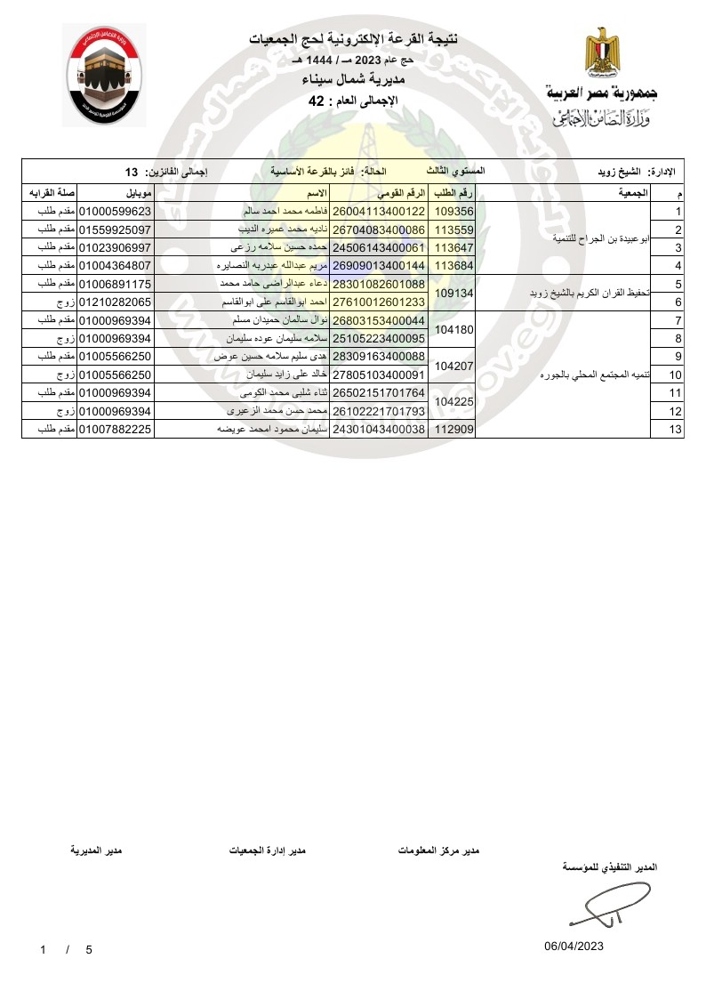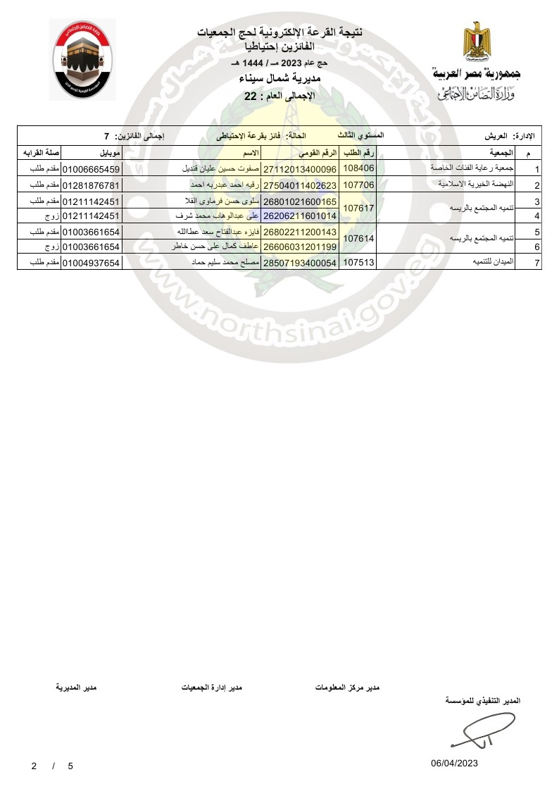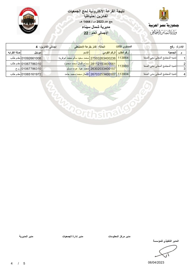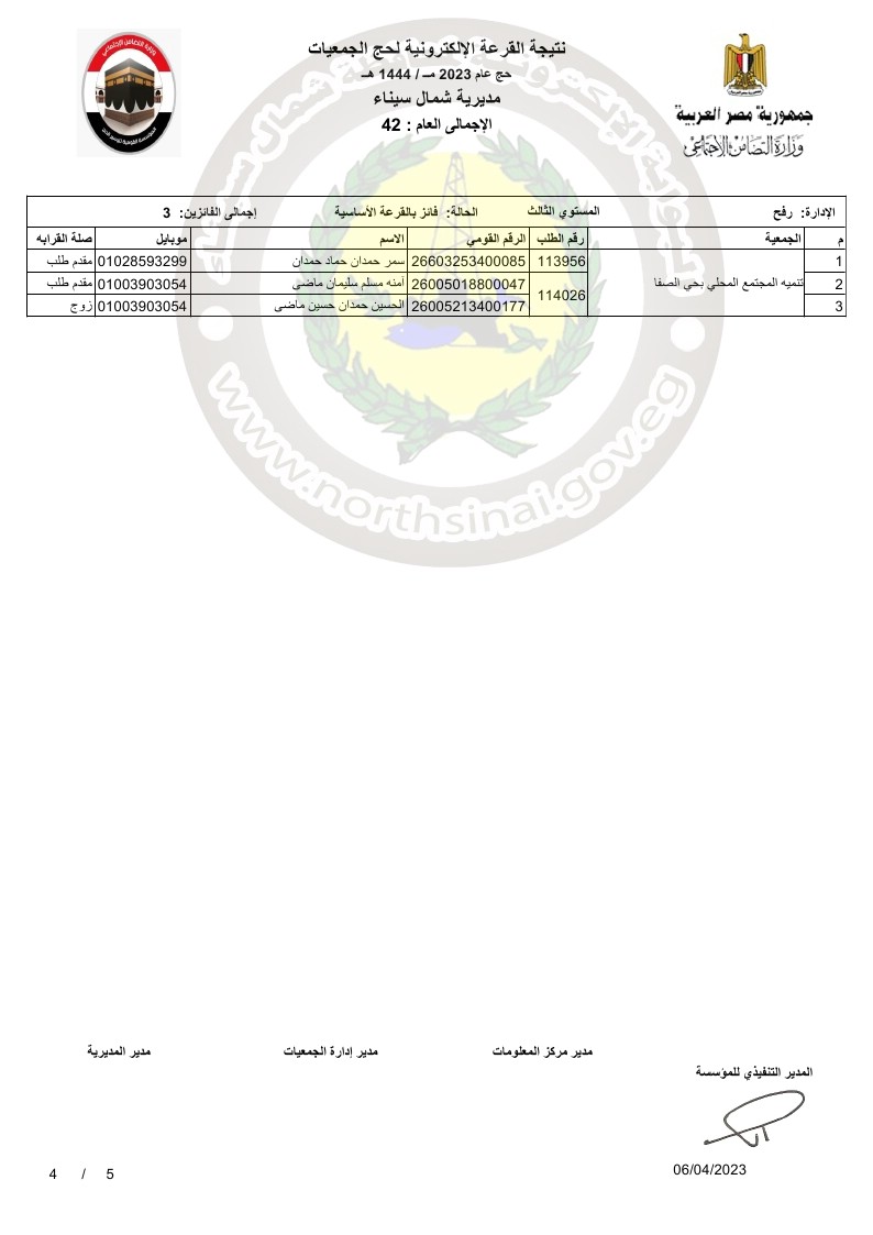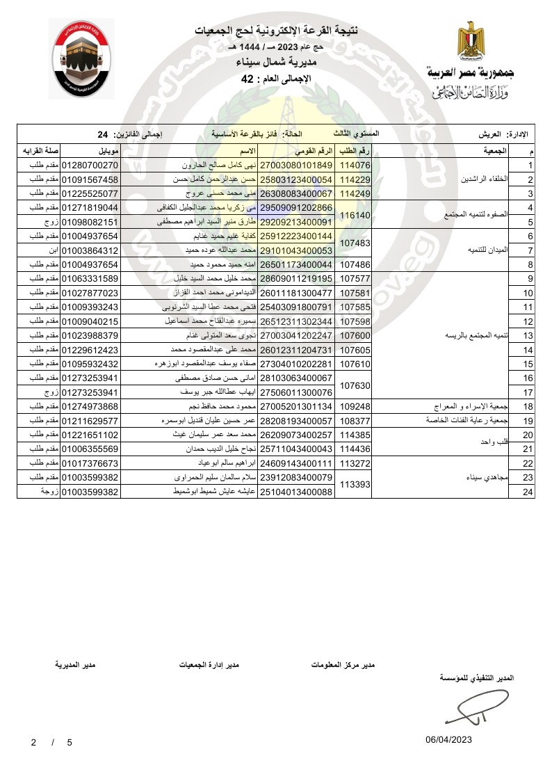 وقال على غيط، مدير عام مديرية التضامن الاجتماعي بشمال سيناء، أنه تقدم 167 شخصًا من الجمعيات الاهلية في محافظة شمال سيناء للحج لهذا العام، اسفرت القرعة العلنية عن فوز 42 شخصًا منهم بتأشيرة حج، من بينهم 24 شخصًا من مدينة العريش، 13 شخصًا بمدينة الشيخ زويد، 3 أشخاص من مدينة رفح، وشخص من مدينة نخل وآخر من مدينة بئر العبد.