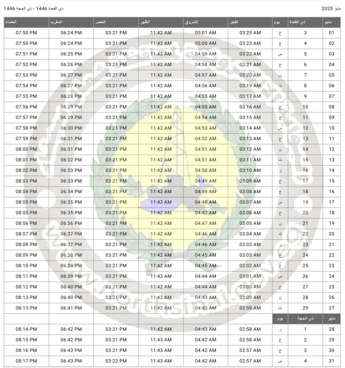 جدول مواقيت الصلاة لمحافظة شمال سيناء عن شهر نوفمبر 2025