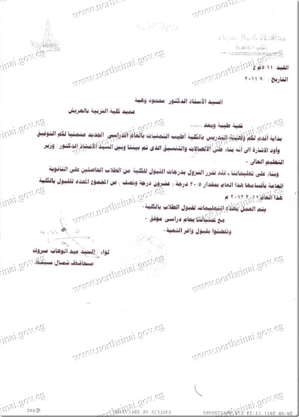 كما اعلن المحافظ عن توفير 10 منح لأبناء سيناء بجامعة سيناء ، واستثناء طلاب المرحلة الثانوية من حد الادني للقبول بكليتي العلوم والتربية بالعريش ، وتم قبول 485 طالب وطالبة أضافي بكلية التربية ،فضلا عن موافقة وزير التعليم العالي علي النزول بنسبة القبول بالمعهد العالي للهندسة والتكنولوجيا إلي اقل من النسبة المقررة 76.3% ، مما حقق طموحات 59 طالبا وطالبه بالالتحاق بالمعهد ،إضافة إلي زيادة عد المقبولين من أبناء المحافظة بالكليات العسكرية إلي 18 طالب ، و 8 طلاب بكلية الشرطة.