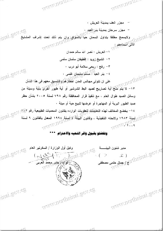 وأعلن اللواء أركان حرب أحمد يوسف عبد النبي قائد قوات حرس الحدود وعضو لجنة تنمية سيناء عن شكره وتقديره للكثير من أهالي شمال سيناء الشرفاء الذين يتعاونون مع قوات حرس الحدود من أجل حماية حدود مصر الشرقية .. مشيرا إلى الموافقة على عدد من مطالب أبناء سيناء .. ومنها استغلال شاطئ البحر المتوسط برفح والشيخ زويد كمصيف ، وإنشاء نقطة سروح للصيادين على ساحل رمانة .. وجارى تطوير ميناء العريش البحري بتكلفة 1.4 مليار جنيه على مراحل ، وإعداد دراسة لإنشاء ميناء صيد منفصل .