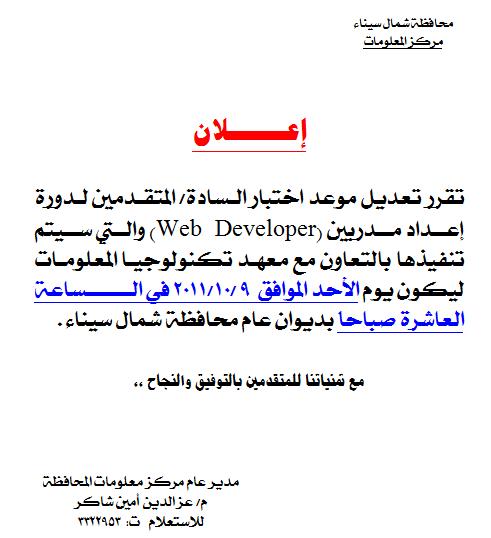 اختتمت بالمدينة الشبابية بالعريش ،الجمعة الموافق 30/12/2011 ،فعاليات أول برنامج للتنمية البشرية يقام علي ارض المحافظة ، للحصول على دبلومه " أسرار النجاح والتميز الوظيفي " الذي نظمه مركز طاقات للتنمية بالتعاون مع أكاديمية " علم " للتطوير البشرية ، وذلك تحت رعاية اللواء السيد عبد الوهاب مبروك محافظ شمال سيناء ، وبحضور الدكتور إبراهيم الفقى رائد التنمية البشرية والمحاضر الدولي والخبير العالمي .