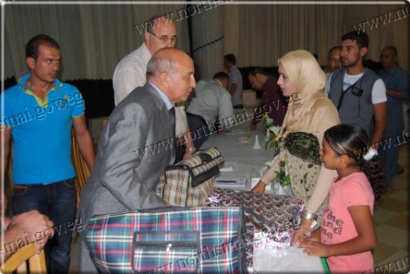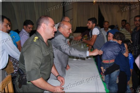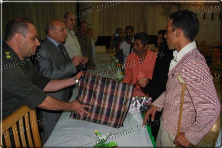 | | قام اللواء السيد عبد الوهاب مبروك محافظ شمال سيناء ، الثلاثاء الموافق 16/8/2011 ، بتوزيع هدايا مقدمه من المجلس الأعلى للقوات المسلحة علي اسر الشهداء و المصابين في الاحتفالية التي اقامتها المحافظة لاسر الشهداء و مصابي الثورة بنادي ضباط القوات المسلحة بالعريش ، بحضور اللواء السيد عبد الوهاب مبروك محافظ شمال سيناء واللواء جابر العربى سكرتير عام المحافظة واللواء سامح عيسى السكرتير العام المساعد واللواء مدحت صالح رئيس مركز ومدينة العريش ومحمود أبو المجد مدير عام التضامن الاجتماعي وبعض قيادات القوات المسلحة .