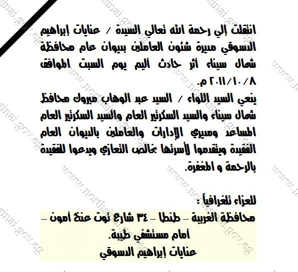 وجه العربي الشكر إلي المشير محمد حسين طنطاوي رئيس المجلس العسكري القائد العام للقوات المسلحة علي الاستجابة السريعة لمطالب أبناء سيناء بإيفاد لجنه من منطقة تجنيد الزقازيق إلي محافظة شمال سيناء تيسيرا علي المواطنين.
