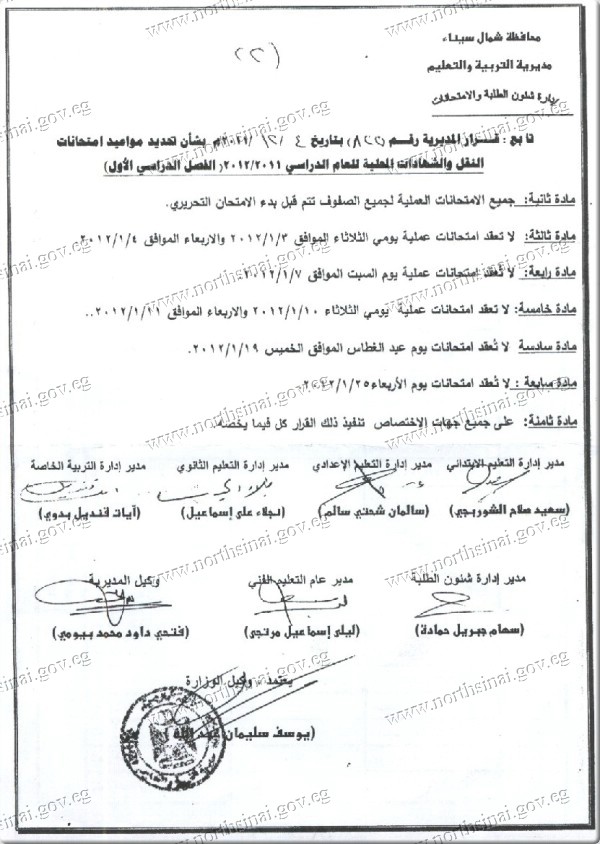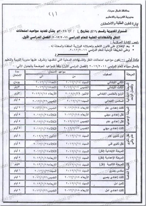 حددت مديرية التربية والتعليم بشمال سيناء مواعيد امتحانات الفصل الدراسي الأول للعام 2011/2012 لسنوات النقل والشهادات العامة المحلية .