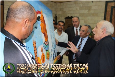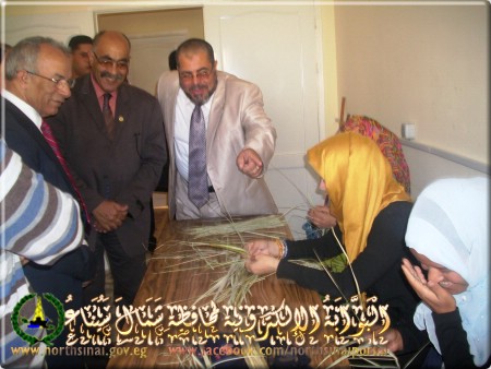 وقد زار المحافظ ورشتى تصنيع الأرابيسك من جريد النخيل والمشغولات اليدوية من سعف النخيل ، واطلع على نماذج من منتجات العاملين .. كما التقى مع المدربين والمتدربين ، والذين طالبوا بمد مدة التدريب وتشغيل الورشتين نظرا لارتفاع معدلات الانتاج من خلال المشروع المنفذ فى اطار اتفاقية التدريب الموقعة بين محافظة شمال سيناء ومشروع اقامة نظم مستدامة للنخيل والزيتون بمحافظة شمال سيناء .