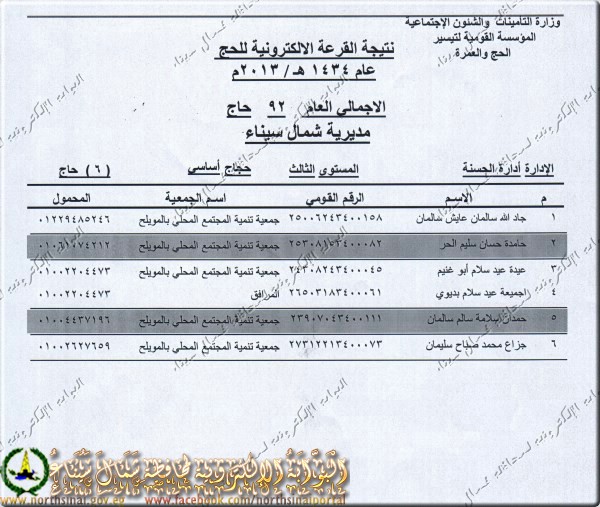تم إجراء القرعة العلنية لحجاج الجمعيات الأهلية لمحافظة شمال سيناء لاستبعاد نسبة 20% يوم الأربعاء الموافق 21/8/2013 عن طريق الحاسب الآلي بوزارة التضامن بالقاهرة من خلال برنامج الحج وسيتم تأجيل أداء الفريضة للأسماء المستبعدة إلى العام المقبل دون الدخول في قرعة جديدة. مع أحقيه العضو في استرداد كامل الاشتراك المسدد في حالة رغبته في ذلك على أن يحتفظ بدوره في الحج في العام المقبل وفقا للأسعار التي سيتم الإعلان عنها، بالإضافة إلى أحقيه العضو الذي سيتم تأجيل حجه إلى العام المقبل أن يحج بدلا منه أحد من أقاربه من الدرجة الأولى وذلك في حالة وجود مانع أو عذر قهري لديه.