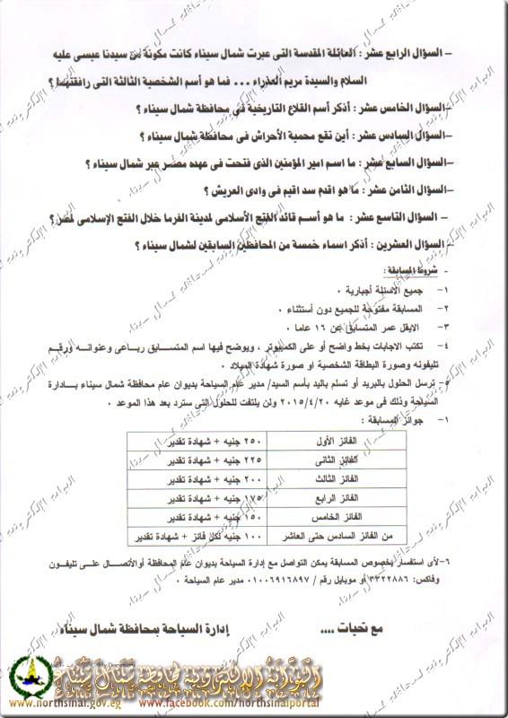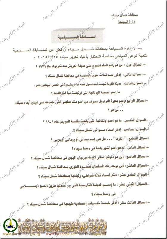 تعلن إدارة شئون البيئة بديوان عام محافظة شمال سيناء عن المسابقة البيئية الثقافية لطلبة المدارس للعام الدراسي 2015/2016 ضمن برامج التوعية البيئية الذي تنفذه بالتنسيق مع التربية والتعليم للمراحل التعليمية المختلفة (ابتدائي – اعدادى – ثانوى ) .