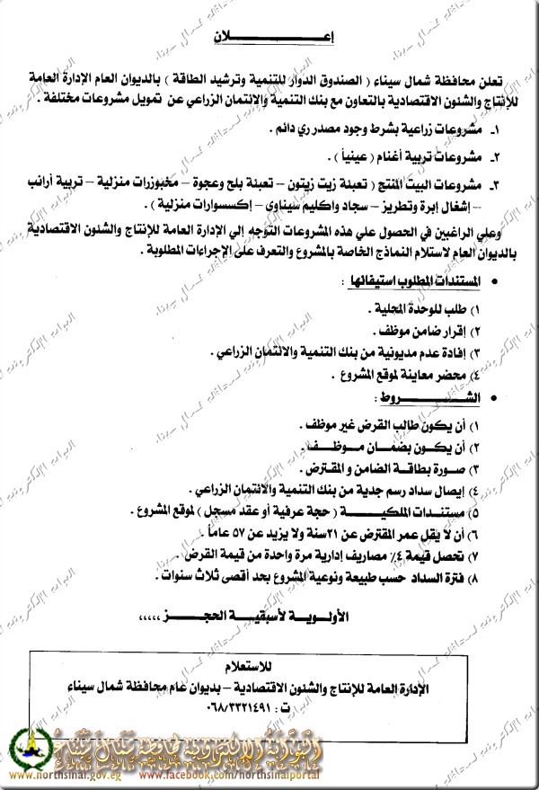وأعلن محافظ شمال سيناء أنه سيتم تشكيل لجنة عليا في كل محافظة برئاسة المحافظ والجهات المعنية تكون مهمتها الوقوف على المعوقات التى تعترض المشروع والعمل على ازالتها فورا .