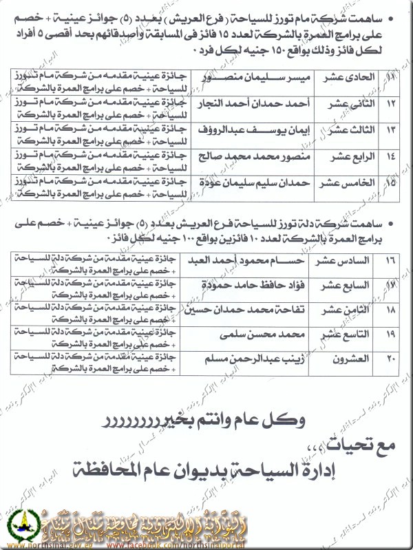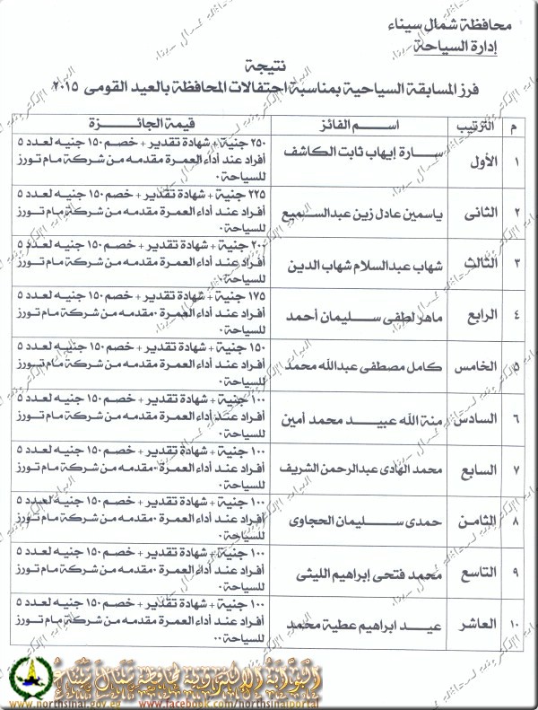 وسيتم تحديد موعد لاحق لتوزيع الجوائز وتكريم الفائزين والجدير بالذكر أن إجمالى قيمة الجوائز المخصصة لهذه المسابقة " سبعة آلاف جنية " حسب تصديق السيد / الوزير المحافظ فى 2/ 9 /2015 0