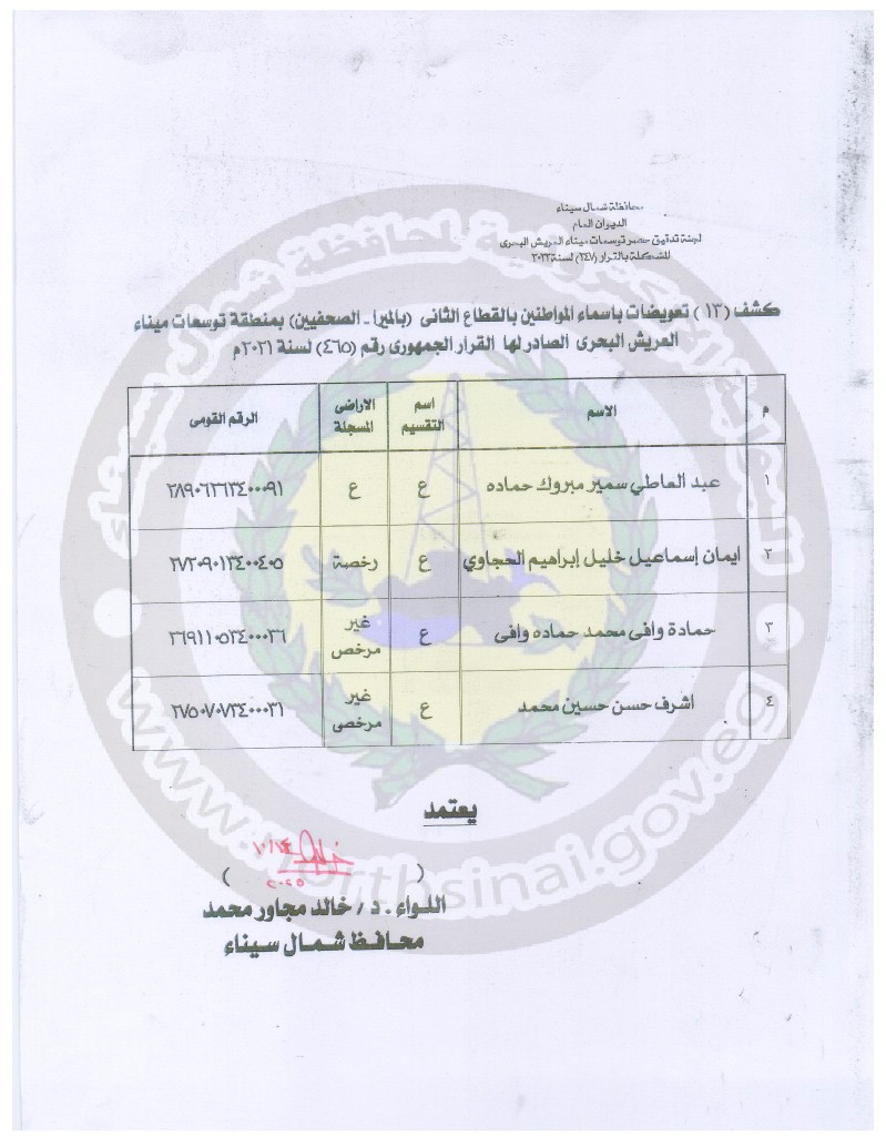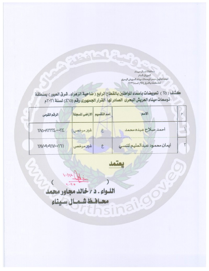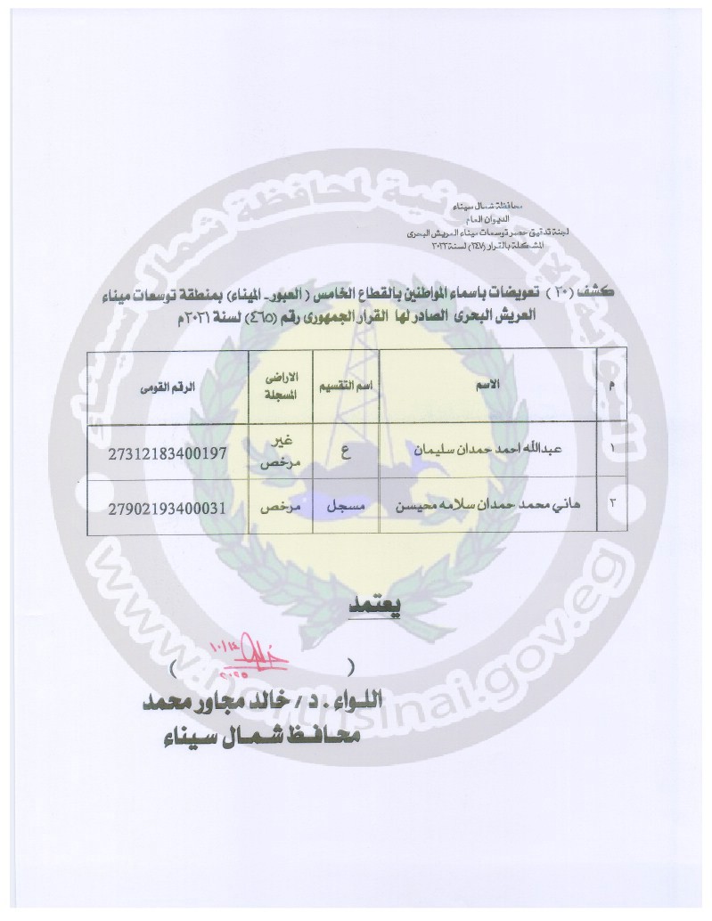 في إطار اهتمام الدولة والقيادة السياسية بسرعة إنهاء الإجراءات وصرف التعويضات ، وبتوجيهات اللواء الدكتور خالد مجاور ، محافظ شمال سيناء ، تقرر صرف التعويضات للمواطنين بالقطاعات الثاني ( بالميرا - الصحفيين ) والرابع ( ضاحية الزهراء - شرق العبور ) والخامس ( العبور - الميناء ).