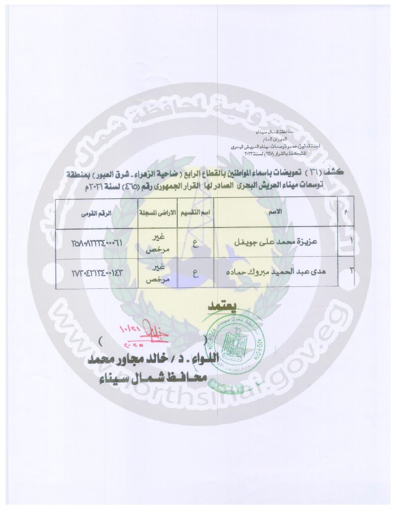 في إطار اهتمام الدولة والقيادة السياسية بسرعة إنهاء الإجراءات وصرف التعويضات ، وبتوجيهات اللواء الدكتور خالد مجاور ، محافظ شمال سيناء ، تقرر صرف التعويضات للمواطنين بالقطاع الرابع ( ضاحية الزهراء - شرق العبور ).
