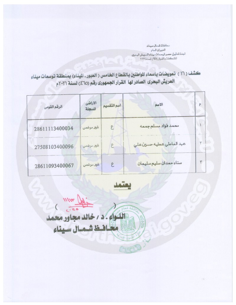 في إطار اهتمام الدولة والقيادة السياسية بسرعة إنهاء الإجراءات وصرف التعويضات ، وبتوجيهات اللواء الدكتور خالد مجاور ، محافظ شمال سيناء ، تقرر صرف التعويضات للمواطنين بالقطاعين الرابع (ضاحية الزهراء - شرق العبور ) والخامس ( العبور - الميناء ).