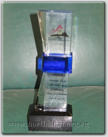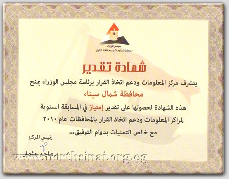 قام مركز معلومات مجلس الوزراء بتكريم المحافظات الحاصلة على تقدير امتياز في المسابقة السنوية لمراكز المعلومات ودعم اتخاذ القرار بالمحافظات لعام 2010 وتسلم العميد / أسامه السرجانى درع المسابقة وشهادة التقدير لفوز مركز معلومات محافظة شمال سيناء بتقدير امتياز في المسابقة بحضور السيد المهندس / عز الدين أمين شاكر مدير عام مركز المعلومات.