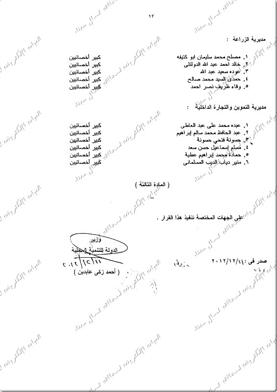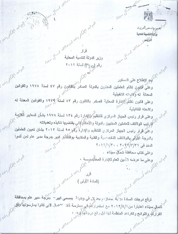 اصدر السيد الوزير / احمد زكى عابدين وزير الدولة للتنمية المحلية قرار رقم 345 لسنة 2012 بترقية عدد (818) من العاملين في وظيفة - بمسمى كبير- بدرجة مدير عام بمحافظة شمال سيناء اعتبارا من 1/4/2012 مع استمرارهم في ممارسة ذات الأعمال التي كانوا يمارسونها وفق القرارات واللوائح والقواعد المنظمة لها قبل رفع درجاتهم ، موزعين كالتالي : ديوان عام المحافظة ومجالس المدن ( 219) ؛ مديرية الشئون الصحية ( 107) ؛ مديرية الزراعة (101) ؛ مديرية الإسكان (20)؛ مديرية الشئون الاجتماعية (31) ؛ مديرية التموين والتجارة الداخلية (58) ؛ مديرية الطب البيطري ( 21) ؛ مديرية القوي العاملة (33) ؛ مديرية الطرق والنقل ( 14) ؛ مديرية التنظيم والإدارة (6) ؛ مديرية التربية والتعليم ( 128) ؛ مديرية الشباب والرياضة (80) .