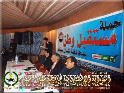 وأضاف المحافظ خلال مؤتمر لدعم الدستور بالعريش،والذي نظمته "حملة مستقبل وطن"، بقاعة المؤتمرات بأحد فنادق مدينة العريش،بحضور اللواء علي العزازي،مساعد مدير امن شمال سيناء، وأمين القصاص، امن حزب الوفد بالعريش،والدكتور أمين عبد الواجد أمين وكيل وزارة الأوقاف بشمال سيناء،والقس وسف صبحي ذكي، ممثلا عن الكنيسة بشمال سيناء،وعدد من الشخصيات السياسية والشعبية بشمال سيناء..أن الدستور الجديد للبلاد دستورًا شاملًا يحث علي حقوق المصريين بكافة طوائفهم،ويعمل علي المساواة وتكافؤ الفرص بين الجميع،و ينص علي اللامركزية وعدم تركز السلطات في يد الرئيس.