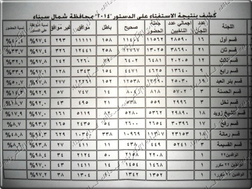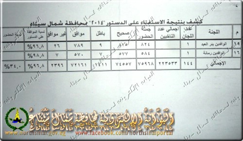 أعلنت اللجنة العليا المشرفة علي الاستفتاء بمحافظة شمال سيناء نتيجة عملية الاستفتاء بالمحافظة، حيث بلغت نسبة الموافقة علي الدستور 96.8% .