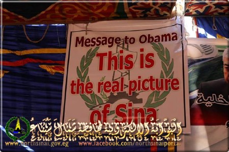 وأرسلت القبائل السيناوية برقية باللغة الانجليزية إلي الرئيس الأمريكي بارك اوباما، من خلال لافته كبيرة جري تعليقها بالمؤتمر كتب عليها" هذه هي الصورة الحقيقة لسيناء" لرفض التدخل الأمريكي في شئون مصر عامة وسيناء خاصة، حيث أن الجيش المصري يقود معركة تطهير حقيقية للإرهاب بسيناء طالب بها المواطن البسيط.