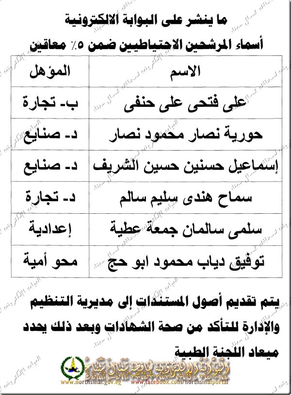 فعلي التالي أسمائهم التقدم لمديرية التنظيم والإدارة بالمستندات الأصلية للتأكد من صحتها وسيتم تحديد ميعاد اللجنة الطبية فيما بعد .