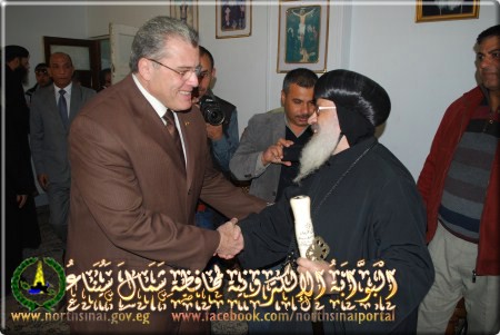 وقد أجرى اللواء السيد عبد الفتاح حرحور محافظ شمال سيناء اتصالا هاتفيا بالأنبا قزمان لتقديم التهنئة له ولكل المسيحيين بمناسبة عيد الميلاد المجيد .