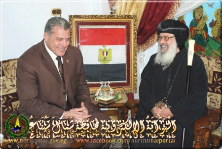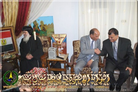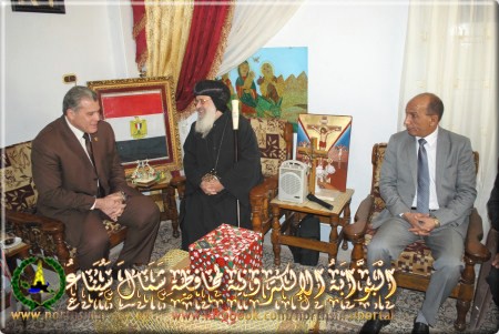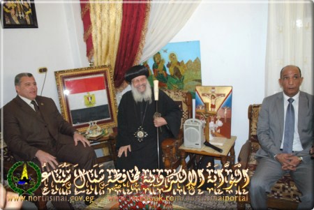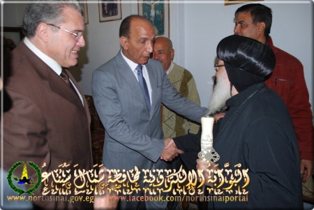 قام اللواء السيد الحبال مساعد وزير الداخلية ومدير أمن شمال سيناء والمهندس فتحي عبد الغنى سكرتير عام محافظة شمال سيناء نائبين عن اللواء السيد عبد الفتاح حرحور محافظ شمال سيناء .. يرافقهما العميد أسامة الغندور رئيس مركز ومدينة العريش ، رحمي بكير عضو مجلس النواب وفتحي راشد مدير عام التموين ومنير أبو الخير مدير عام التضامن الاجتماعي والمهندس عاطف مطر مدير عام الزراعة والمهندسة ليلى مرتجى وكيل مديرية التربية والتعليم وحسناء الشريف مقررة المجلس القومي للمرأة وقيادات المجلس والقيادات السياسية والتنفيذية والشعبية ورجال الدين الإسلامي بالأوقاف والأزهر الشريف وممثلي الأحزاب والقوى السياسية والحزبية ومنظمات المجتمع المدني .. بزيارة الى مطرانية المسيحيين بضاحية السلام بالعريش لتقديم التهنئة بالعيد .. حيث كان فى استقبالهم الأنبا قزمان أسقف سيناء الشمالية وعدد من القساوسة ورجال الدين المسيحي والأسر المسيحية .