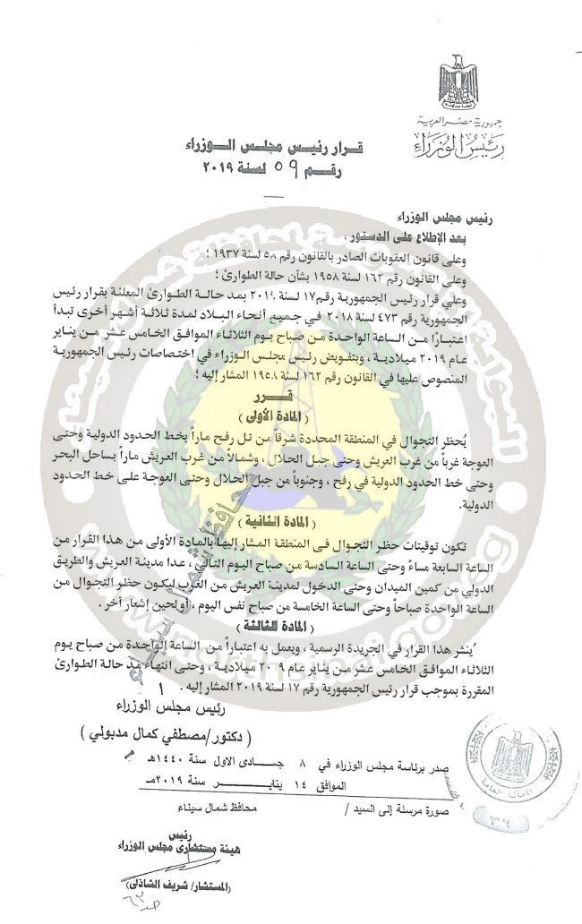 قرار رئيس مجلس الوزراء رقم 59 لسنة 2019 بشأن حظر التجوال