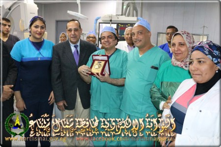 وقدم المحافظ درع المحافظة إلى الدكتور جمال شعبان عميد المعهد القومي للقلب ، وشكر جميع أفراد الطاقم الطبي .. مشيرا إلى أنه تم إجراء إحدى العمليات الجراحية الناجحة بوحدة القسطرة القلبية ، وهناك 4 عمليات أخرى جارى إجرائها .