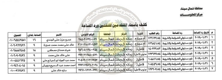 أسماء السادة المتقدمين لتقنيين وضع اليد بمركز بئر العبد طبقاً للقانون 144 لسنة 2017 ، وبتاريخ 31/1/2019 ، ظهرت نتيجة الفحص بمعرفة المتغيرات السكانية لعدد (7) حالات والرد ( غير مستوفي للضوابط والشروط ) .