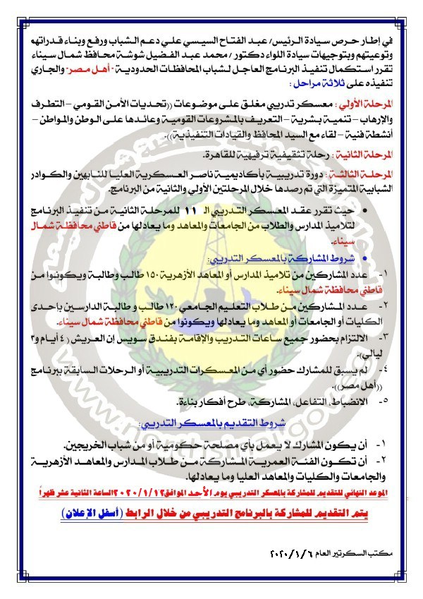 الاعلان عن المعسكر التدريبي الحادي عشر للمرحلة الثانية من برنامج (اهل مصر) لطلاب المدارس والمعاهد والجامعات من قاطني محافظة شمال سيناء