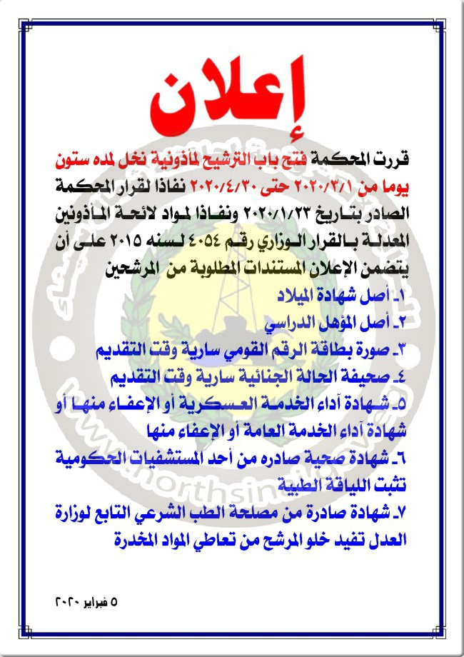 الاعلان عن فتح باب الترشيح لمأذونية نخل لمدة ستون يوما من اول مارس وحتي نهاية ابريل 2020