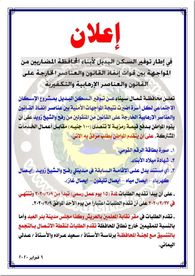 الاعلان عن مشروع الاسكان الاجتماعي لكل أسرة أضيرت نتيجة المواجهات الأمنية بين عناصر إنفاذ القانون والعناصر الارهابية الخارجة عن القانون من المنقولين من رفح والشيخ زويد