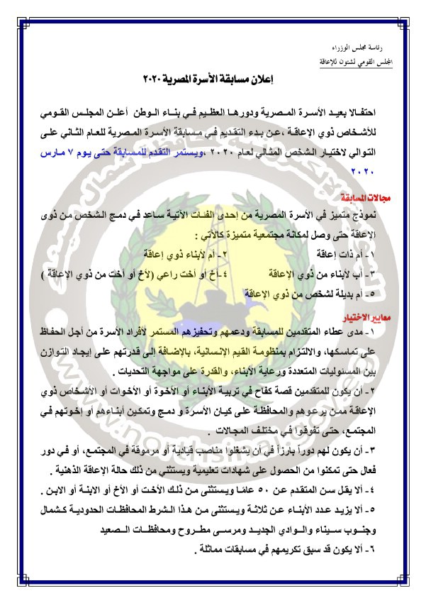 المجلس القومي للأشخاص ذوي الإعاقة يعلن عن بدء التقديم في مسابقة الأسرة المصرية 2020