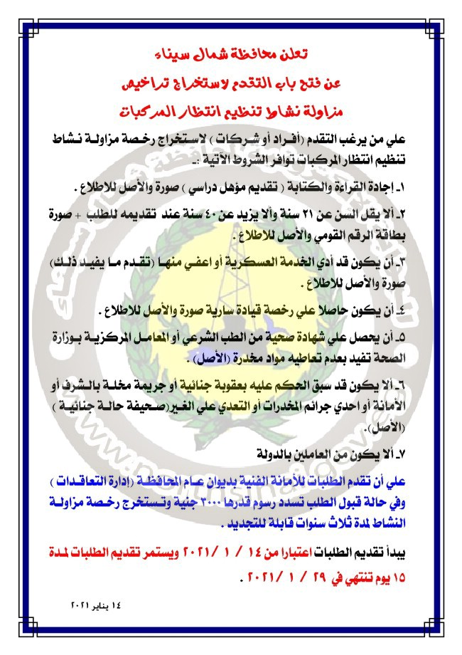 محافظة شمال سيناء تعلن عن فتح باب التقدم لاستخراج تراخيص مزاولة نشاط تنظيم انتظار المركبات