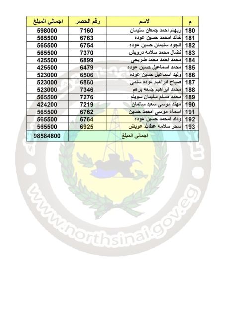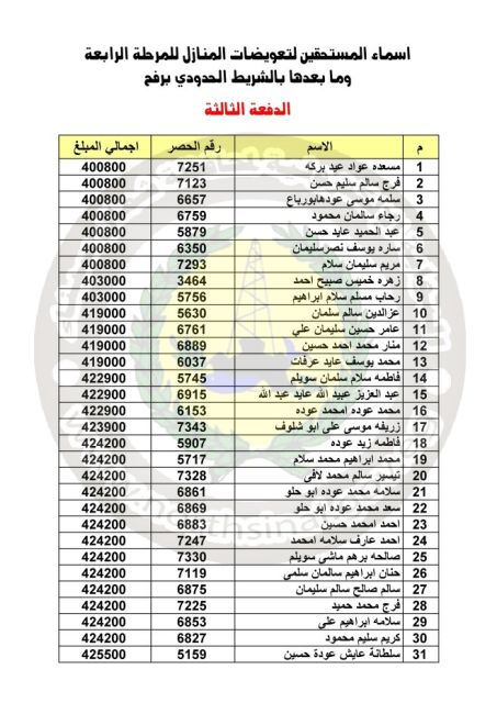 ننشر أسماء الدفعة الثالثة ( بعدد 193 مواطناً ) للمستحقين لتعويضات المنازل للمرحلة الرابعة وما بعدها بالشريط الحدودي برفح ، علي أن يتم الصرف اعتباراً من الثلاثاء الموافق 26/1/2021 من مركز ومدينة رفح .