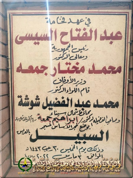 قام الدكتور محمد عبد الفضيل شوشة محافظ شمال سيناء .. يرافقه العميد مصطفى محمد مصطفى رئيس مركز ومدينة رفح والدكتور إبراهيم جمعة إبراهيم مدير عام الأوقاف .. بوضع حجر الأساس لإقامة مسجد حي السبيل بالعريش بتكلفة قدرها 6 ملايين جنيها بتمويل من وزارة الأوقاف .