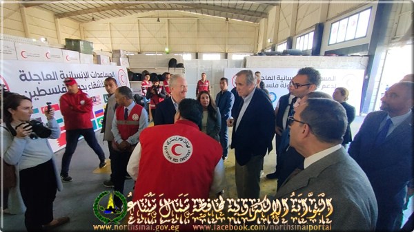 وقام الوفد بتفقد مختلف الأقسام في مخازن الهلال الأحمر المصري بالعريش، واستمع الي شرح من مسؤولي الهلال حول كيفية استقبال المساعدات التي تصل الي مدينة العريش وطرق تخزينها وترتيبها ووضعها على شاحنات لإيصالها الي قطاع غزة.