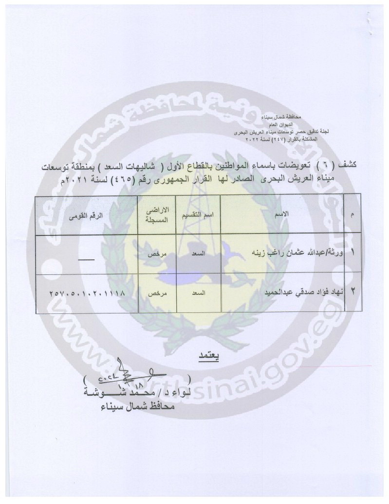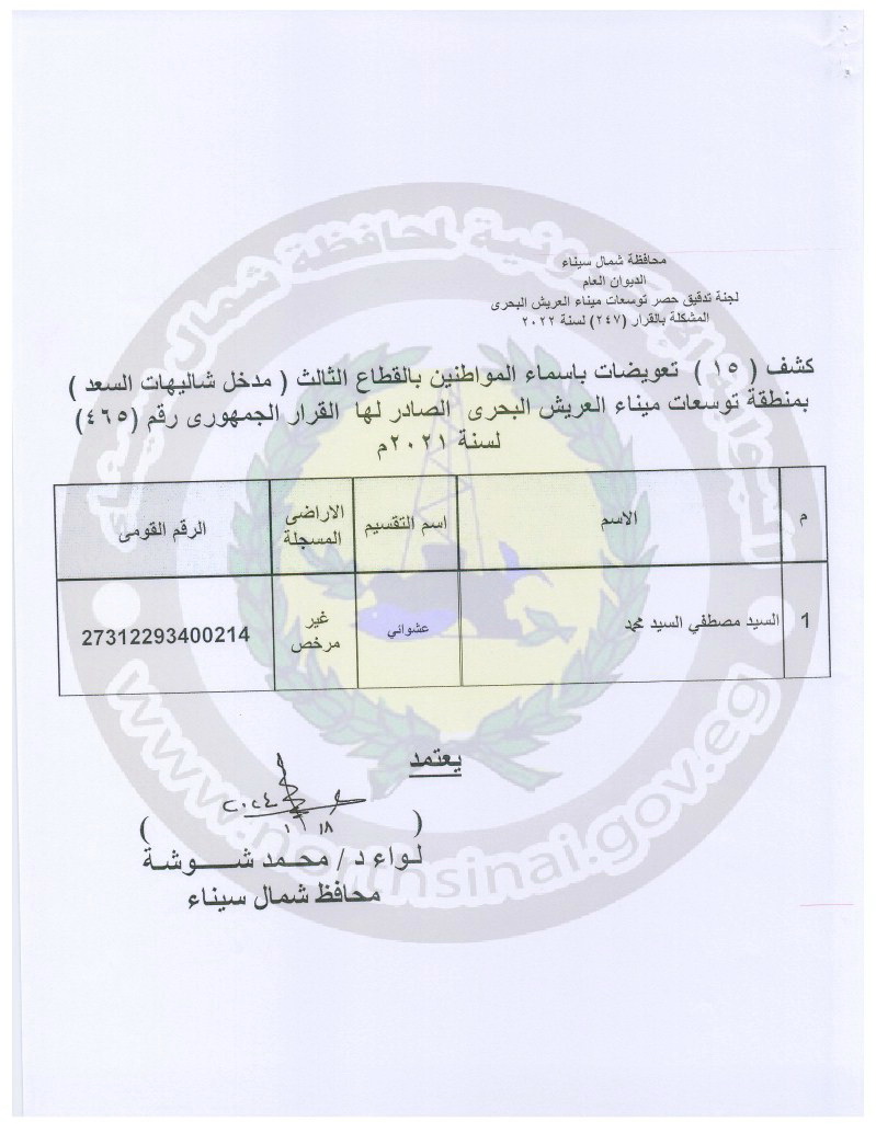 في إطار اهتمام الدولة والقيادة السياسية بسرعة إنهاء الإجراءات وصرف التعويضات ، وبتوجيهات اللواء الدكتور محمد عبد الفضيل شوشة ، محافظ شمال سيناء ، تقرر صرف التعويضات للمواطنين بالقطاعين الأول ( شاليهات السعد ) والثالث ( مدخل شاليهات السعد ) .