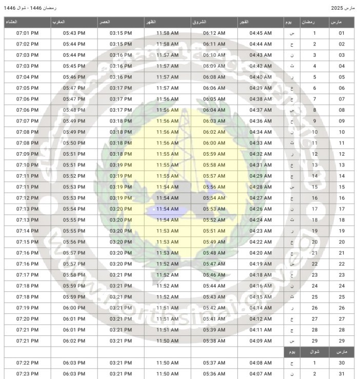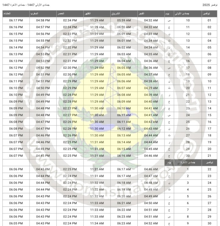 جدول مواقيت الصلاة لمحافظة شمال سيناء عن شهر نوفمبر 2025