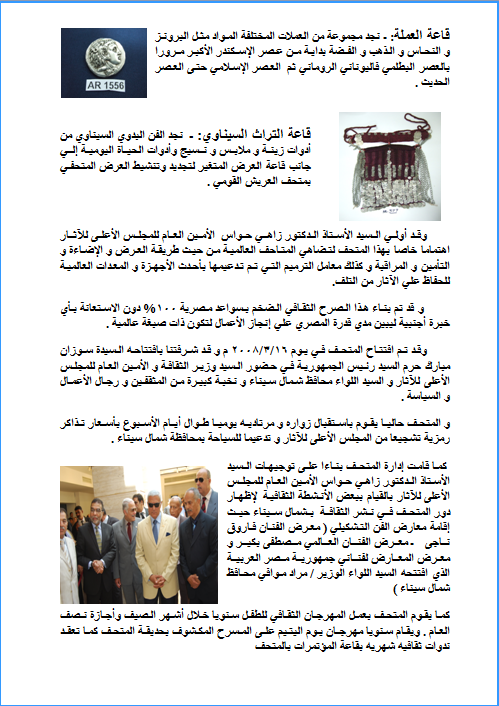 تبلغ تكلفـة إنشائه نحو 45 مليون جنيه إفتتحته السيدة الفاضلة / سوزان مبارك يــوم 16/3/2008 ويضم 8 قاعـــات وهى تجسد تاريخ سيناء من عصر الإنسان الأول والعصور القديمة والوسطى والحديثه .