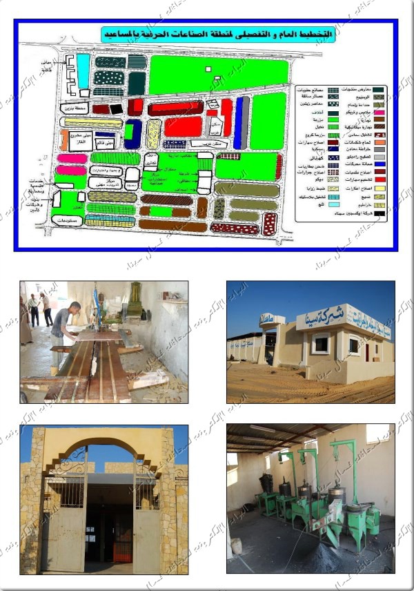 1) صدر بإنشائها قرار السيد الوزير /المحافظ رقم2لسنة87 وتقع غرب مدينة العريش على مساحة 1كم2 بهدف تفريغ المدينة من جميع الورش المقلقة للراحة وتوفير ألاماكن الصالحة لإقامة الصناعات الحرفية والورش والمصانع الصغيرة بالمحافظة .