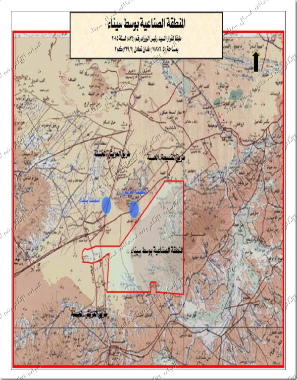 صدر قرار السيد المهندس / رئيس مجلس الوزراء رقم (834) لسنة 2015 بتخصيص مساحة 78386.5 فدان تعادل 329288720.7م2 لصالح محافظة شمال سيناء لاستخدامها في إقامة منطقة صناعية عليها،