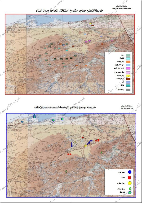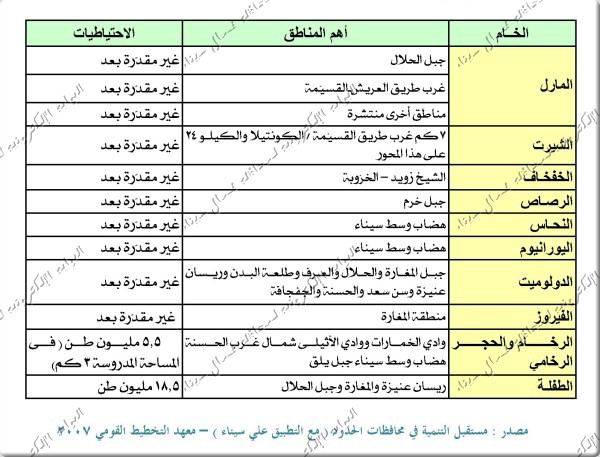 ج. وتتوافر فى وسط سيناء العديد من الثروات والخامات التعدينية مثل الرخام بأنواعه المتميزة (فلتو الحسنة – التريستا – سيناروز – ابيض سينا – البوتشينو – البريشيا – الامبرادور- جولدن المغارة – سربجندا) والتى تماثل اجود انواع الرخام الايطالية والعالمية ويقدر الاحتياطى من تلك الخامات لمناطق الدراسة بنحو 9.5 مليون م٣ ويتواجد بمنطقة جبل يلق والمغارة ويتم تصدير الرخام حاليا إلى العديد من دول العالم مثل الصين وايطاليا – الرمال البيضاء ( رمال الزجاج) والتى توجد باحتياطيات تصل الى ٢٧ مليون طن تمتاز بنقائها العالى حيث تصل الى 99,5% وتستخدم فى صناعة الزجاج والبللور والسيراميك وصناعة الأسمنت الأبيض ويتم تصدير كميات كبيرة منه الى تركيا من خلال ميناء العريش البحرى وتتواجد الرمال البيضاء بمنطقة المنشرح ووادى ام هضب ووادى ام سعيد ووادى فيللى بجبل يلق وجبل منظور بالمغارة ووادى الحظيرة بجبل الحلال – الفحم الذى يوجد بمنطقة جبل المغارة ويصل الاحتياطى الى ٥٢ مليون ،كما تتوافر مواد البناء والرصف (تربة زلطية – دولوميت – زلط – رمال ) بكميات واحتياطيات ضخمة والتى ساهمت ومازالت تساهم فى تعمير سيناء فى شتى المجالات